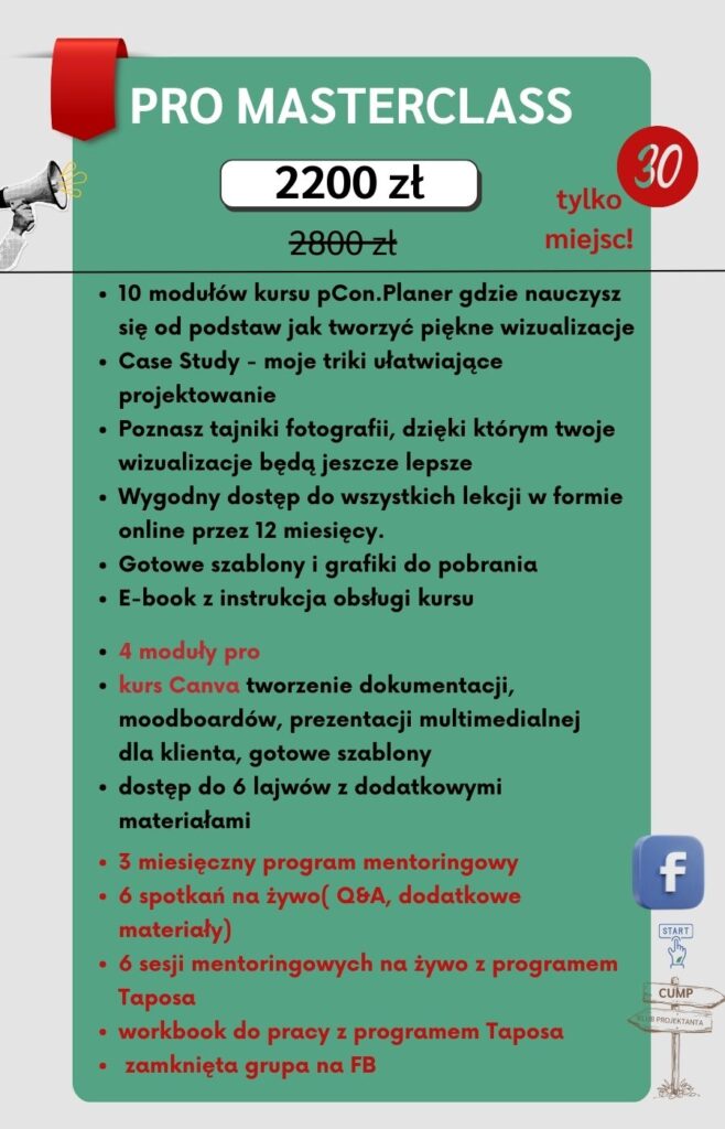 Na kursie PRO MASTERCLASS będziemy już od 25.lutego rozwijać nie tylko nasze wizualizacje ale i firmę oraz siebie same. Dzięki 6-etapowemu programowi TAPOSA znajdziesz swoje fundamenty, zdobędziesz pewność siebie. Odkryjesz kim faktycznie jest twoja grupa docelowa. W oparciu o swoje wartości i talenty, przygotujesz plan marketingowy i strategię dla swojej marki i firmy!